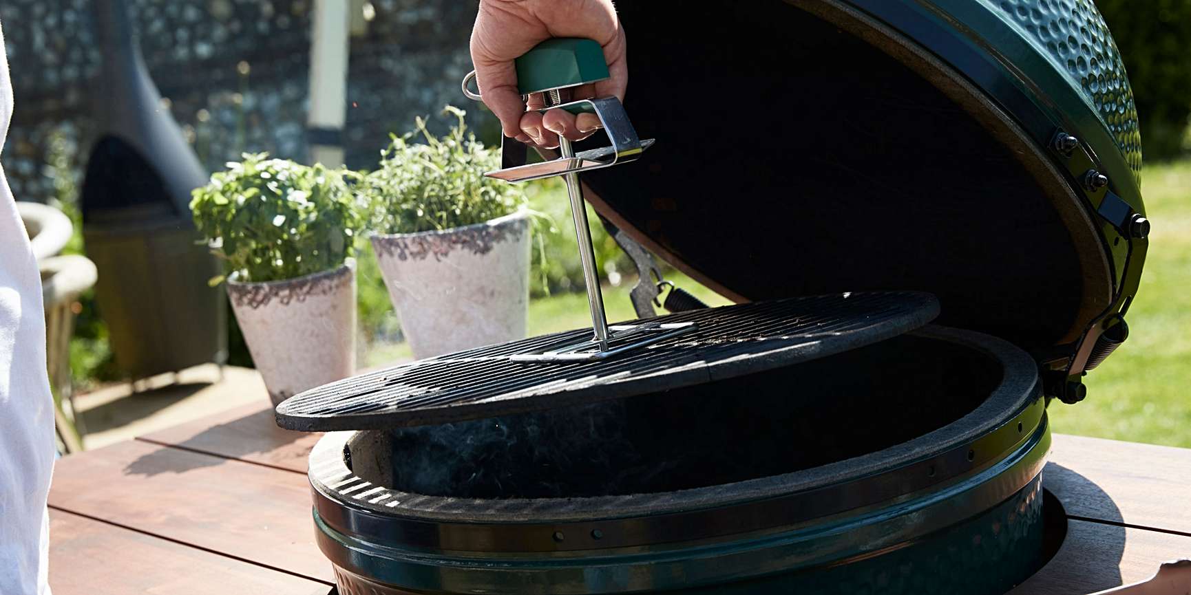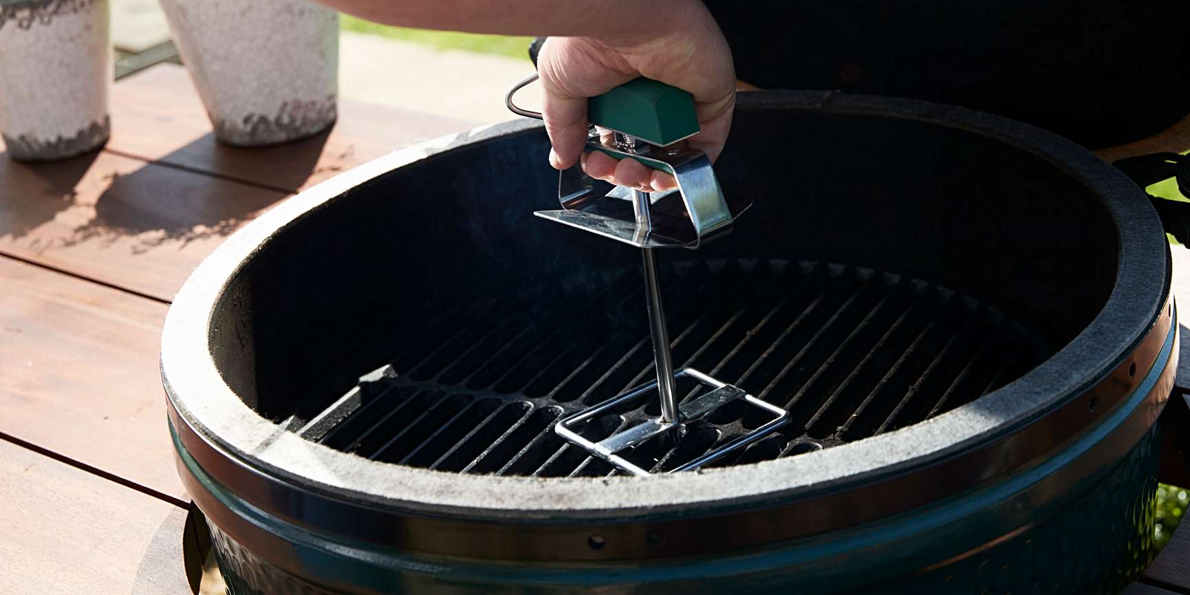 The clever lock or release design makes easy work of removing hot & heavy grids. The plate under the handle provides added protection for your hand against the rising heat. One Grill Lifter is enough to easily remove the heavy cast iron grid from the Large EGG but two are recommended for the Extra Large Searing Grids.