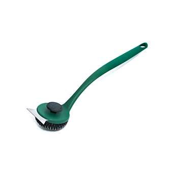 The patented grill scrubber wire brush cleans quickly, easily, and its bristles won’t come loose. The handle is also extra-long, to keep heat safely at a distance. Comes with one stainless steel replacement scrubber pad.