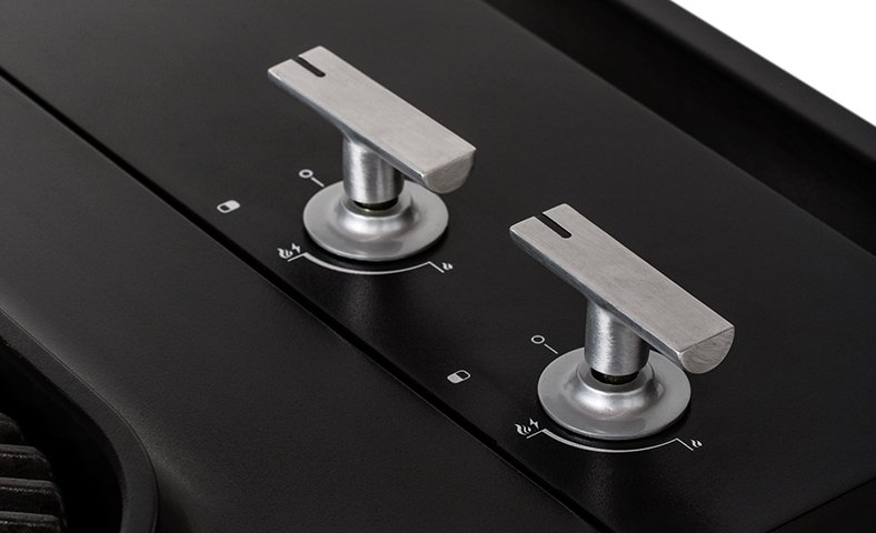 Interchangeable cast-iron flat plates, and grill plates with integrated flame-tamers. Mean you can easy adjust the set-up to suit your food.