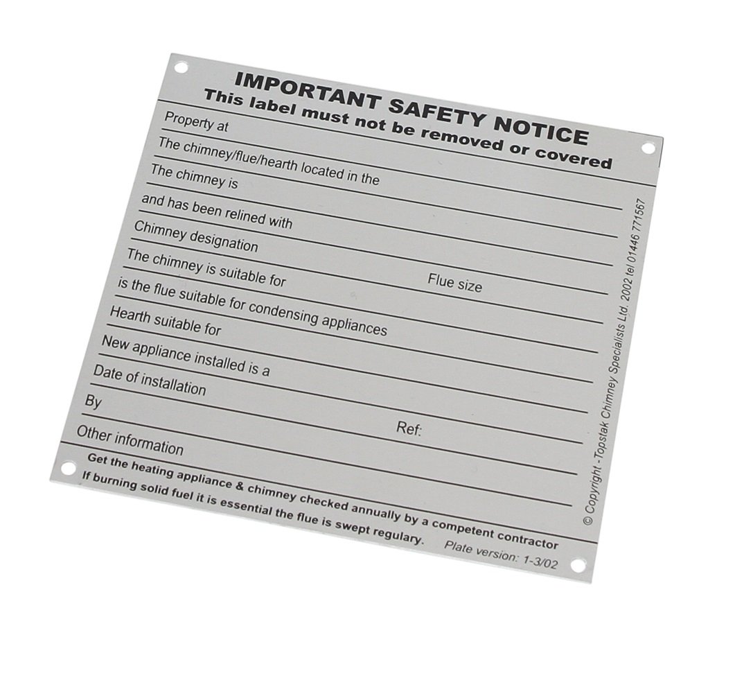 The Topstak metal Chimney Notice plate shown to the left measures 110mm x 110mm and is made from aluminium with an anodised finish. The relevant details can be written onto the plate with an Aerospace felt tip marker pen or similar permanent marker.
