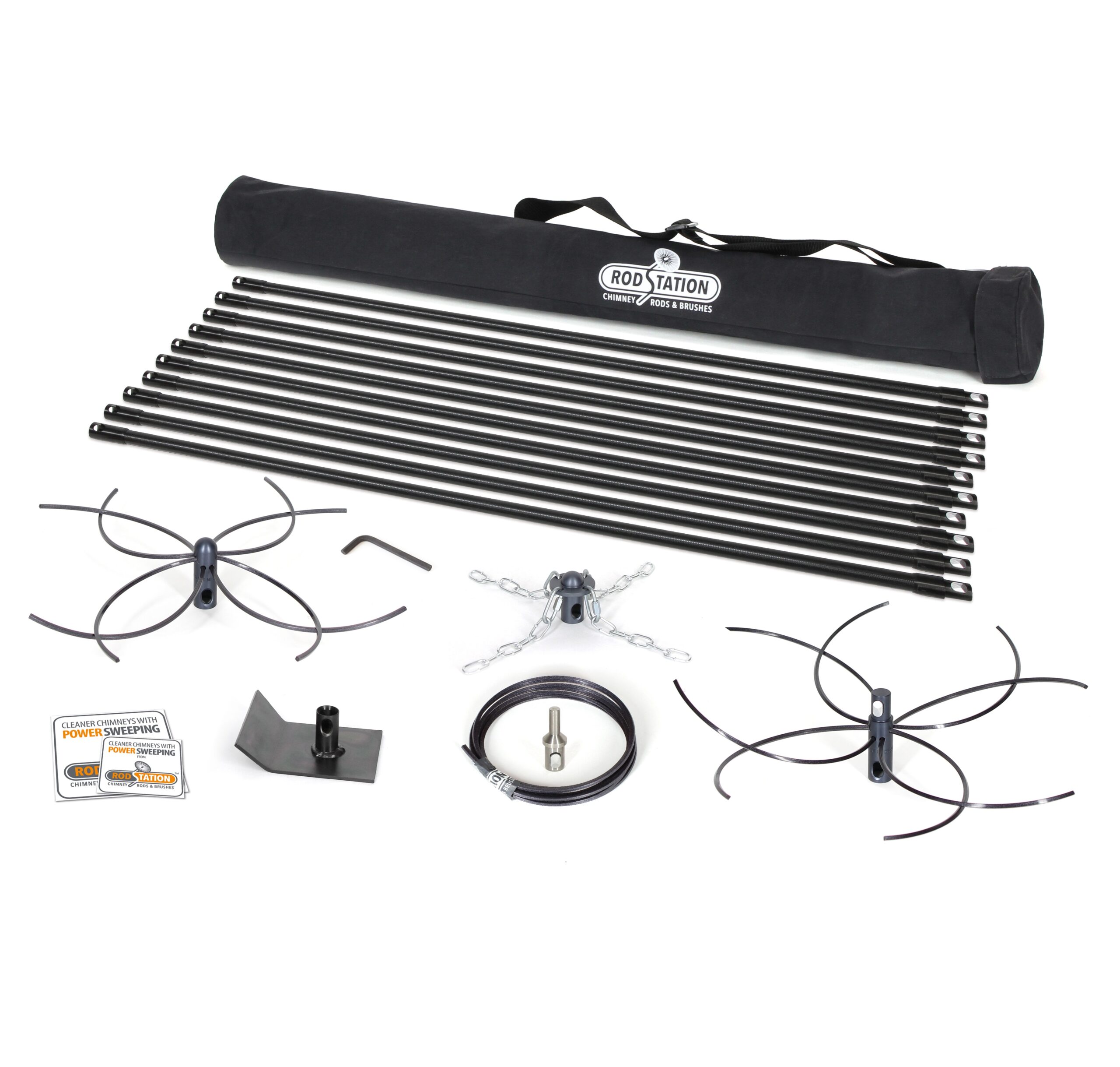 Kit Contents 10 x 1 metre 20mm Rigid rods, 1 x Drill connector, 1 x FlueBoss Nylon large, 1 x FlueBoss Nylon Shaft, 1 x Flueboss Chain Large, 1 x single angled scraper, 3 metre length of FlueBoss Nylon, Free Heavy duty rod bag, Free large & small Van Sticker included