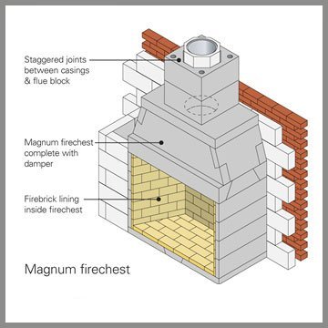 The range includes fire chests with fire openings from 500 to 1250mm wide. Each fire chest is packed on a pallet with detailed assembly instructions .The fire chest is load bearing and will carry up to 2600kg of chimney above, although you may exceed this weight with the use of additional lintels.