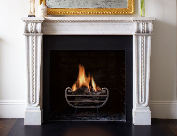 A handsome statuary marble chimneypiece incorporating strong classical influences. The pilasters have tapering panels decorated with a repeating intricately carved motif terminating beneath robust corbels. The frieze has plain recessed panels beneath a breakfront shelf with a tier of crisp egg and dart carving.