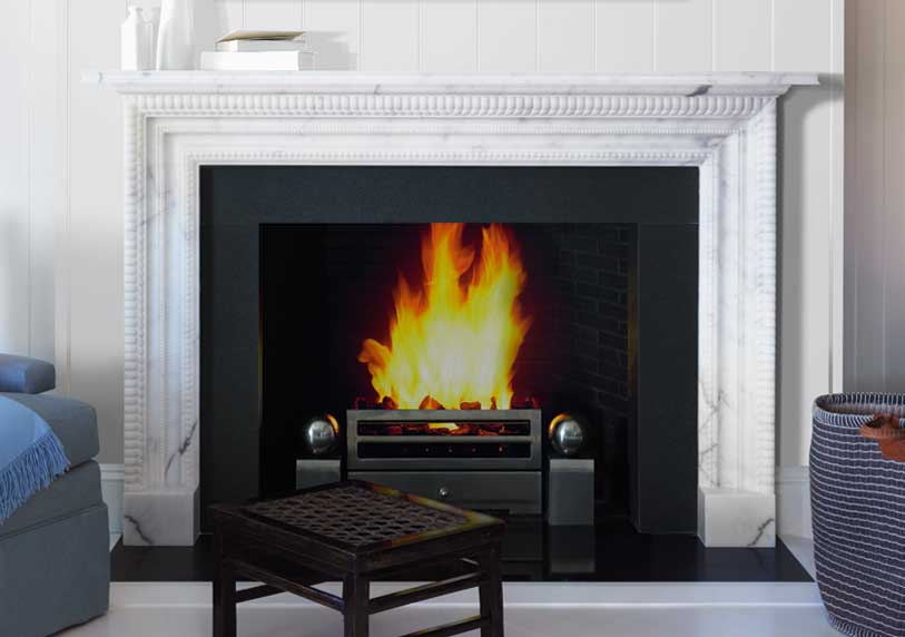 The Carlton is a chimneypiece of simple construction in statuary marble enriched by a series of finely carved mouldings to both the pilasters and frieze.