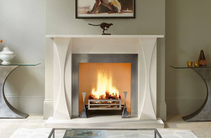 The Faulkner surround is carved in limestone with the distinctive sweeping design in the pilasters reflected in the accompanying Faulkner polished steel fire dogs.