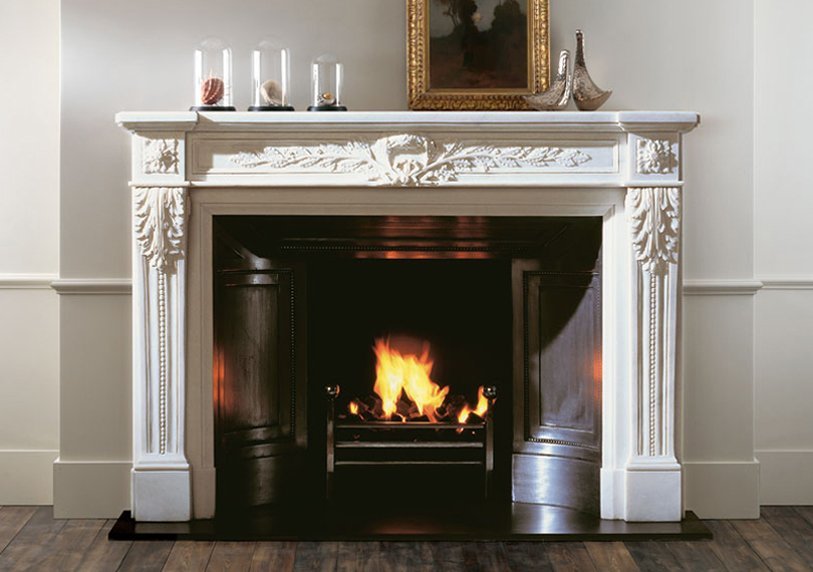 A French style marble chimneypiece of 18th century design having carved rosettes on the corner blocks above console jambs headed by Acanthus leaf carvings and incorporating carved wreath and trailing foliage to the frieze.