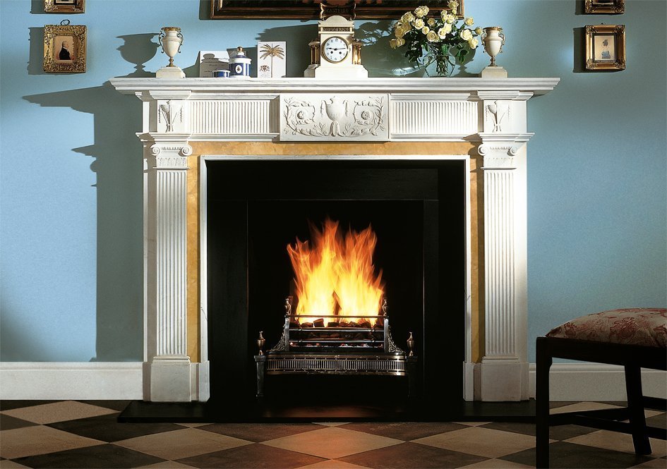 The Blenheim is a grand fireplace in the style of William Chambers. It has fluted pilasters with Ionic capitals and a frieze which incorporates a central tablet with an urn and foliage.