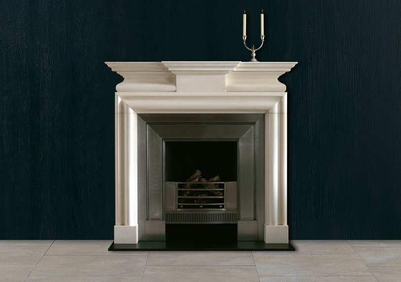 A mid 18th century chimneypiece in statuary marble with breakfront corniced shelf and incorporating a bolection moulding framing the aperture beneath a semi barrel frieze with plain projecting centre tablet.