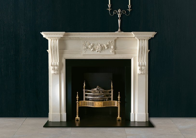 A fine example of mid 18th Century design with robustly carved acanthus corbels with floral centre tablet with statuary marble ingrounds.