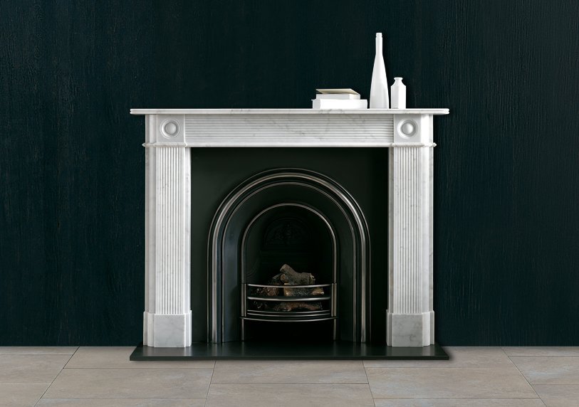 A Regency style marble surround having reeded jambs and frieze with bullseye capitals.