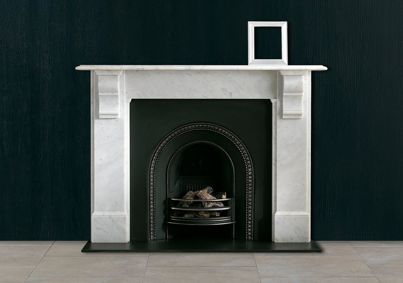 A popular late 19th century design with plain jambs and frieze and simple moulded corbel supporting a generous mantel shelf. Standard production material is Carrara marble priced as indicated.