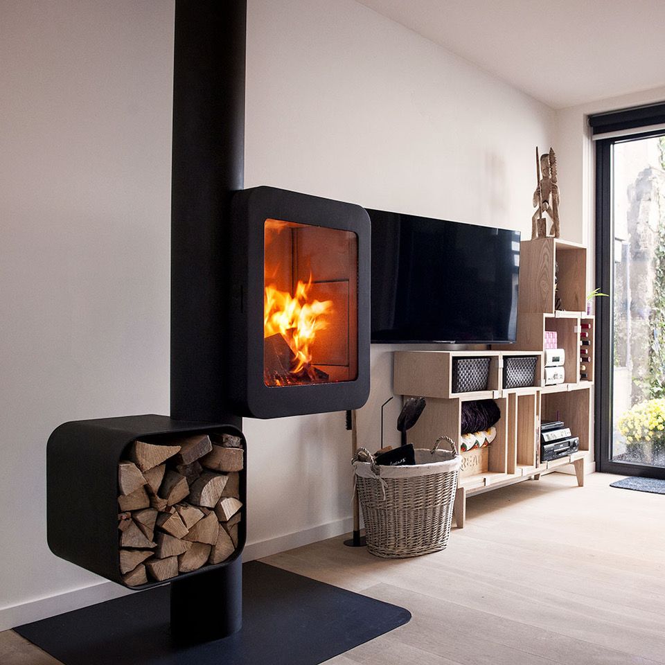 Grappus is more than a wood stove: it is a composition that rhythmically structures space, giving the fire the high note. The height of the hearth, counterbalanced by the offset wood rack, makes the stove easy to use and adapts well to any space. Grappus successfully cross-fertilises a high-performance stove, a contemporary design that reveals the flames in all their splendour, and an easily accessible wood rack.