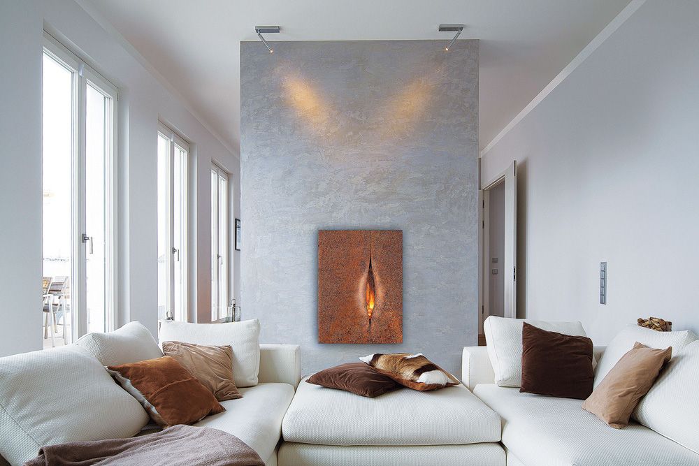 The forged façade of the Metafocus 2 is made of raw steel (thickness 15 mm) that is rusted naturally, creating a mottled finish. The two doors can be either installed to open on hinges or to slide open horizontally. The model has a built-in hearth of firebricks and an interior glass door that opens on side hinges as well as slides open.