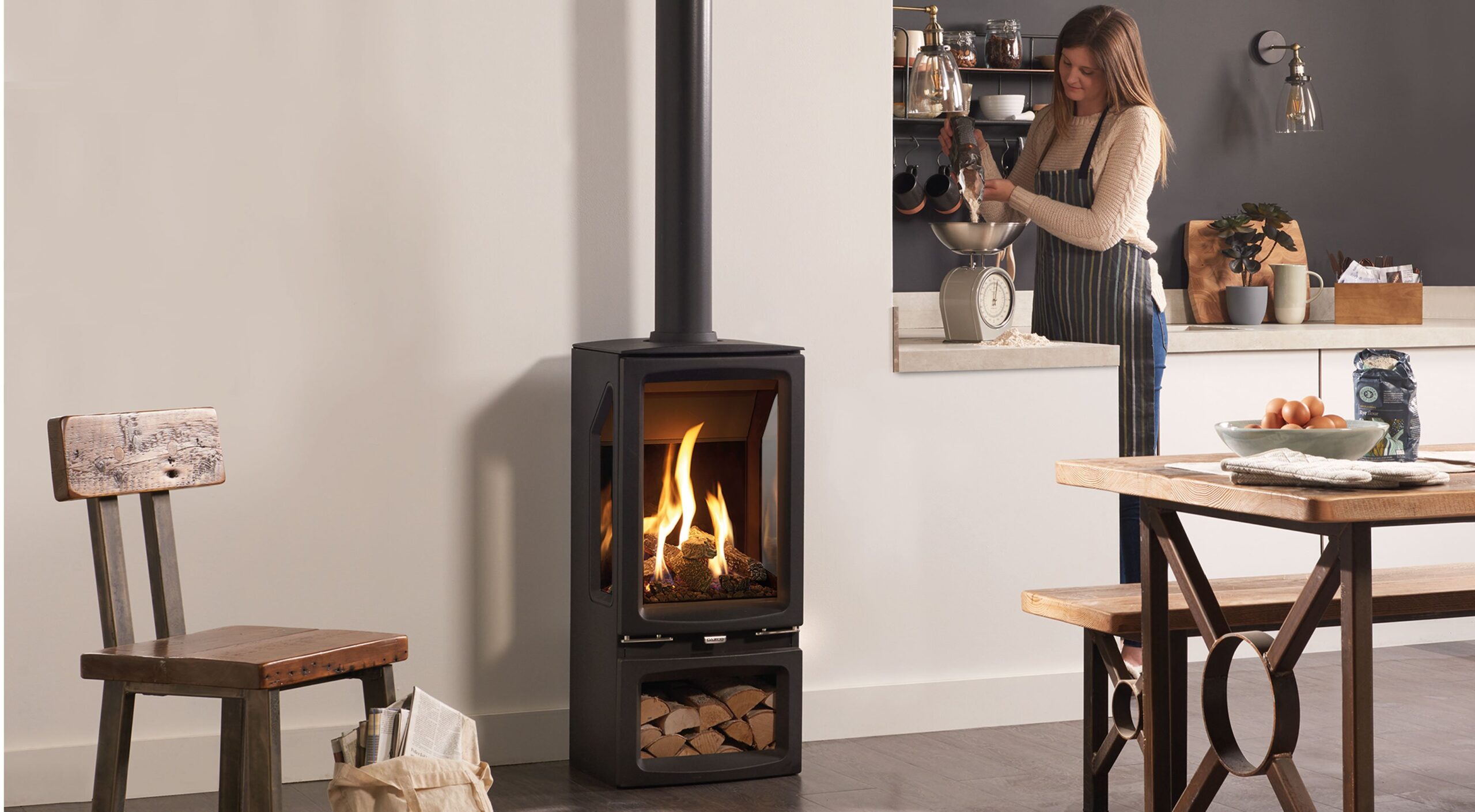 Vogue Midi T stoves feature a highly realistic log-effect fuel bed which is reflected on multiple sides by Gazco’s EchoFlame Black Glass interior. Each ceramic log is positioned to create varied and natural flames almost indistinguishable from a real wood burning fire.