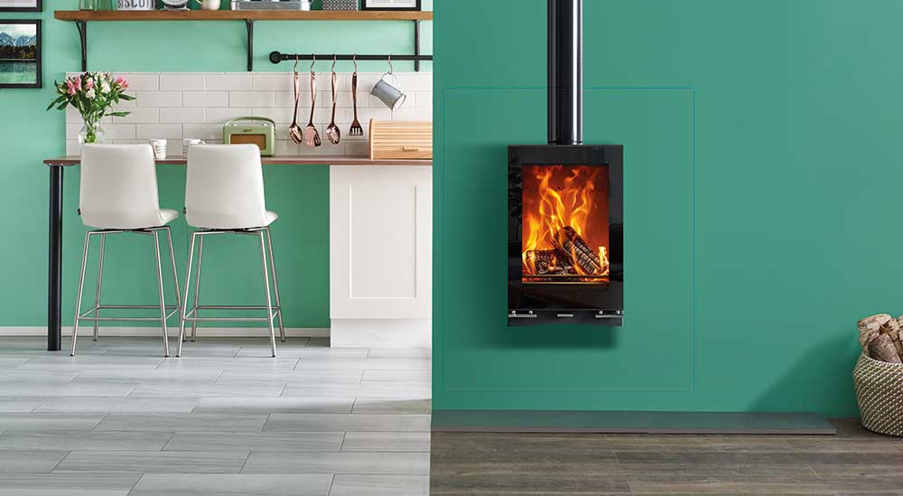 Perfect for settings such as kitchens or dining areas, the Stovax Vision Midi T Wall Mounted wood burning and multi-fuel stove raises the flames for optimum visibility. This ultra-modern stove perfectly suits this designer installation option, adding a chic centrepiece in any setting.
