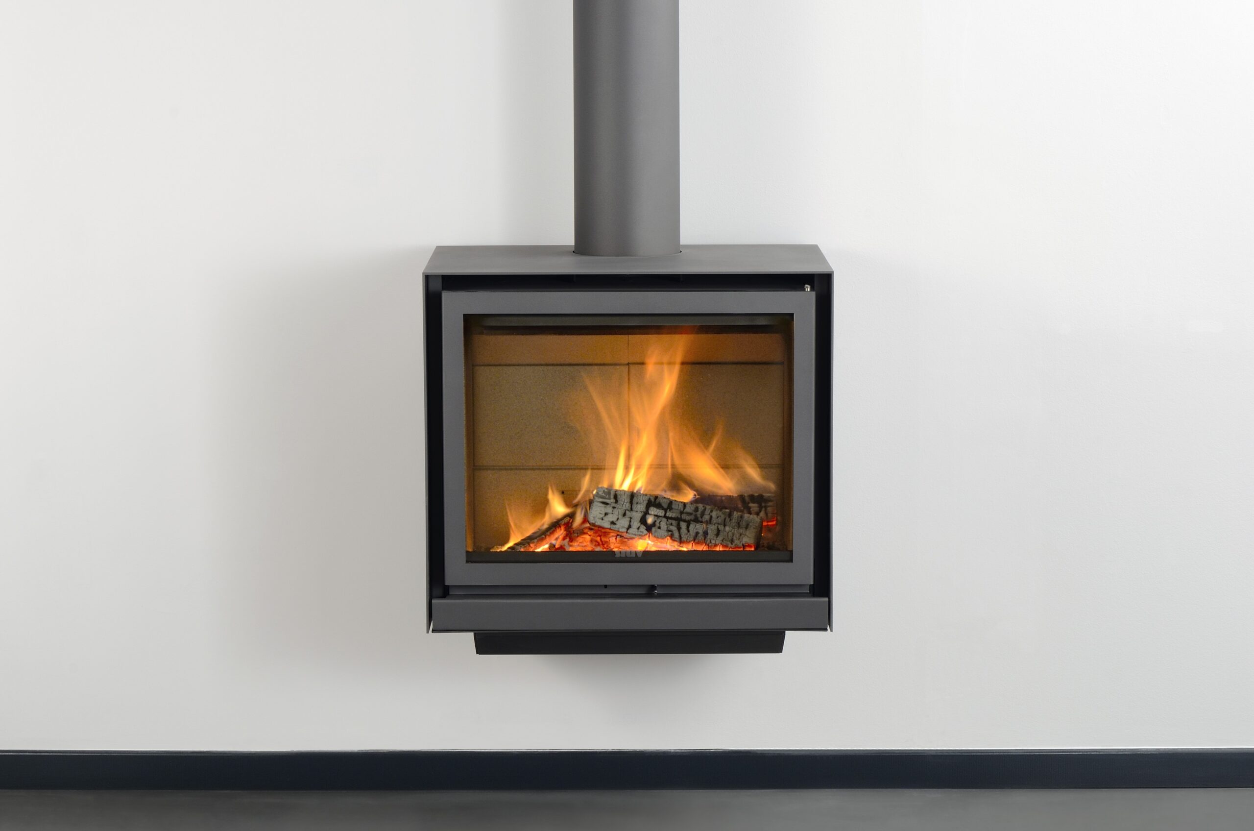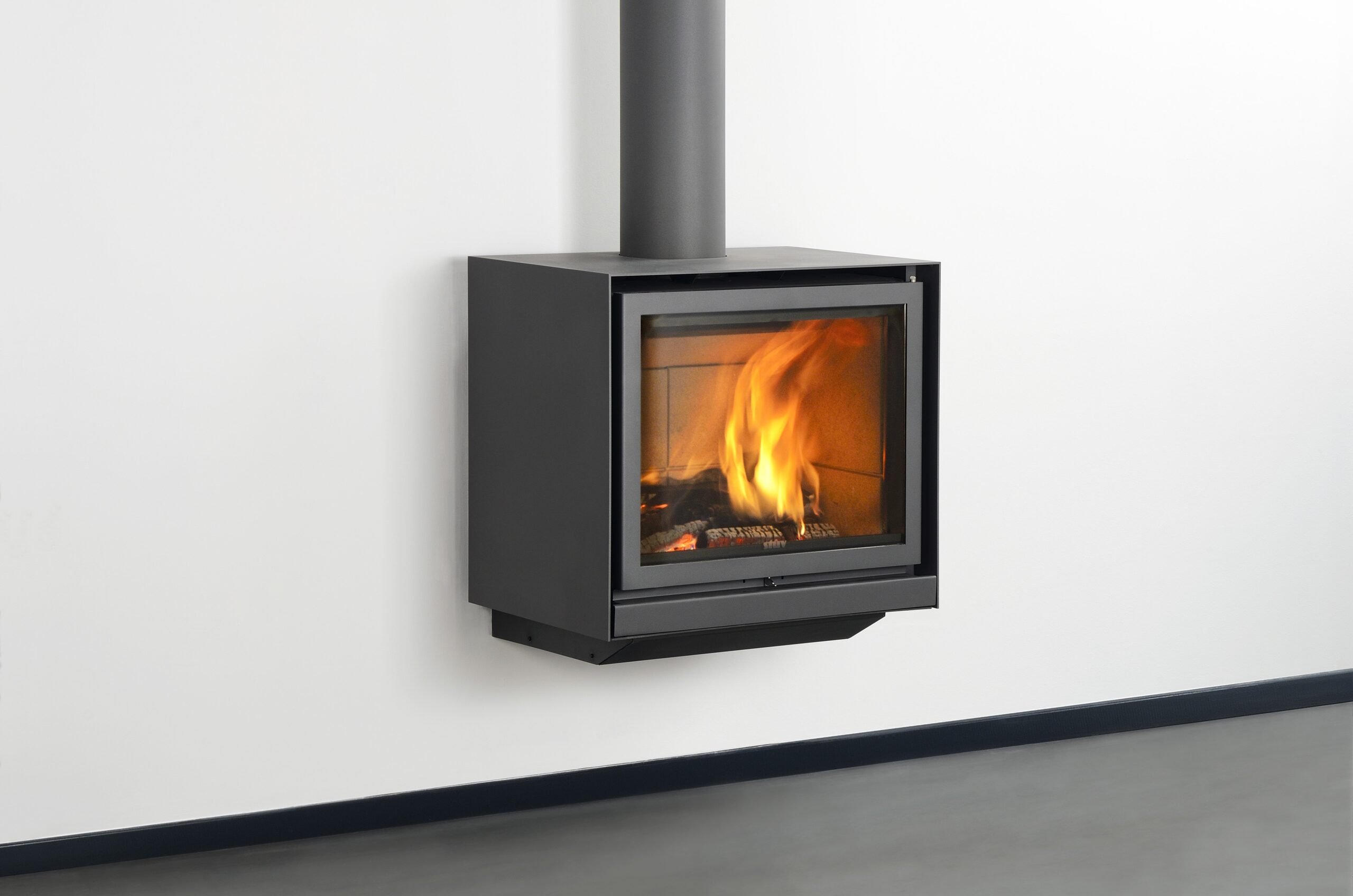 Its glass door gives an amazing view of the spectacle of the flames. The visual effect of the suspended stove completes the picture: freeing up the floor space makes the room appear bigger. It owes its excellent performance to a system that recovers the heat contained in the combustion gases.